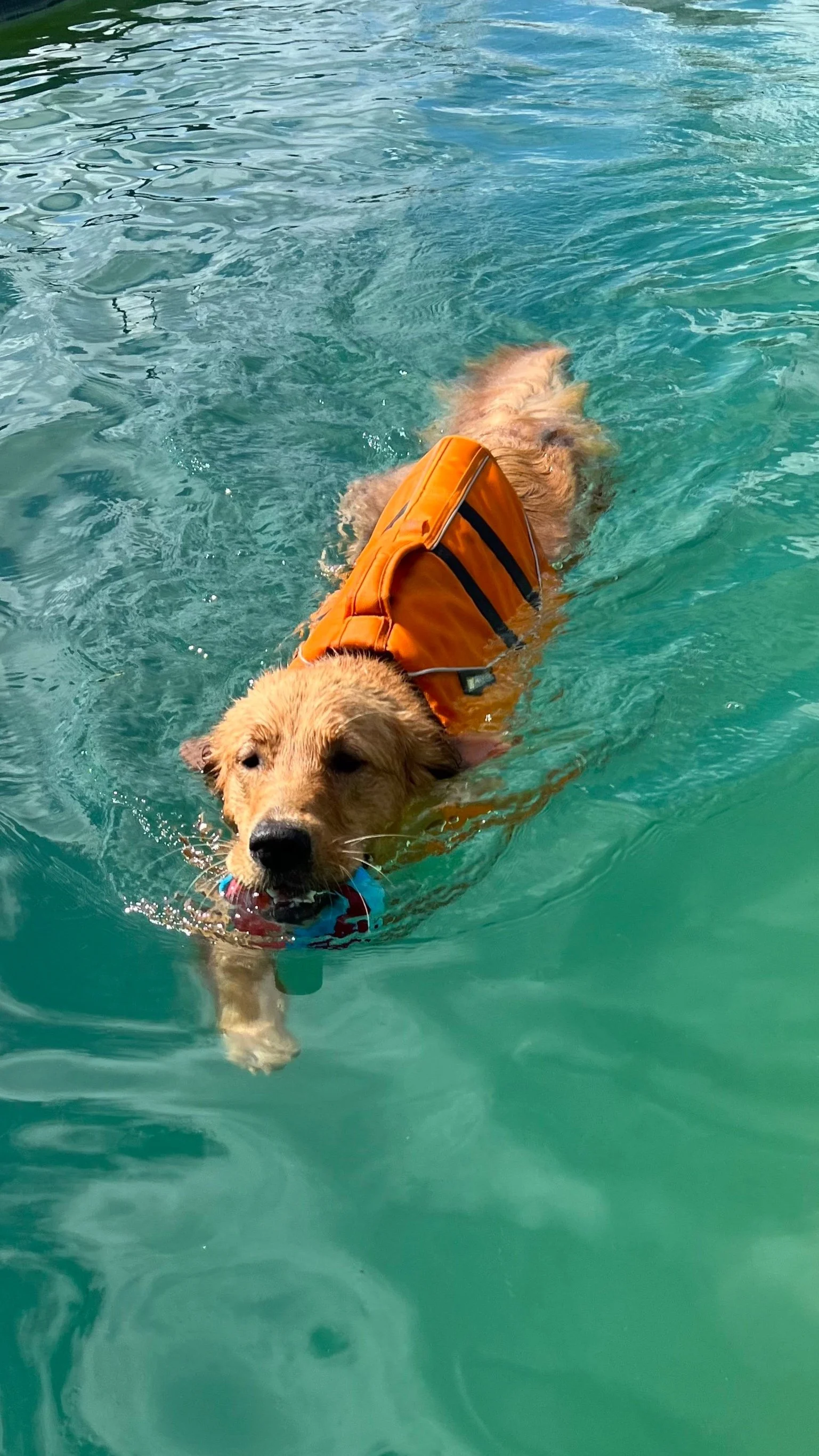 Puppy swim sessions are offered to familiarize dogs with water (older dogs with no water experience welcome!)